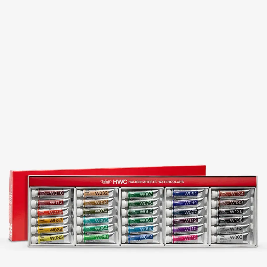 - Contents Include: 30 x 5ml Holbein Artist's Watercolour Tubes: Burnt Sienna 134, Cobalt Blue (Tint) 091, Lemon yellow 033, Crimson Lake 010, Compose Blue 096, Jaune Brilliant No. 2 032, Ivory Black 138, Permanent Green No. 2 067, Vermilion Hue 019, Permanent Yellow Deep 037, Permanent Green No.1 066, Prussian Blue 097, Viridian (Tint) 061, Rose Madder 012, Terre Verte 065, Yellow Ochre 034, Sepia 136, Chinese White 002, Grey of Grey 153, Ultramarine Deep 094, Burnt Umber 133, Opera 013, Emerald Green 064, Cobalt Green 063, Aureolin 039, Olive Green 074, Cobalt Violet Light 110, Cerulean Blue 092, Mineral Violet 112