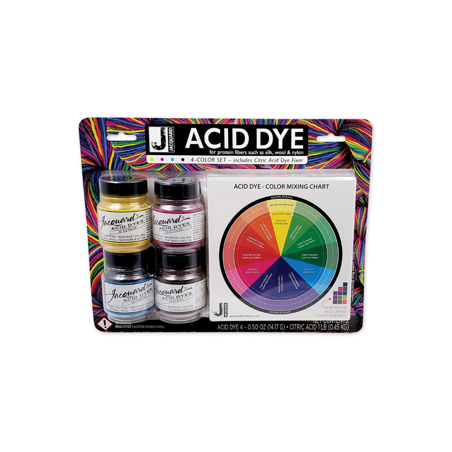 The Jacquard Acid Dye 4 Colour Set with Citric Acid is a complete dyeing kit designed for use on protein fibres such as silk and wool, as well as nylon.